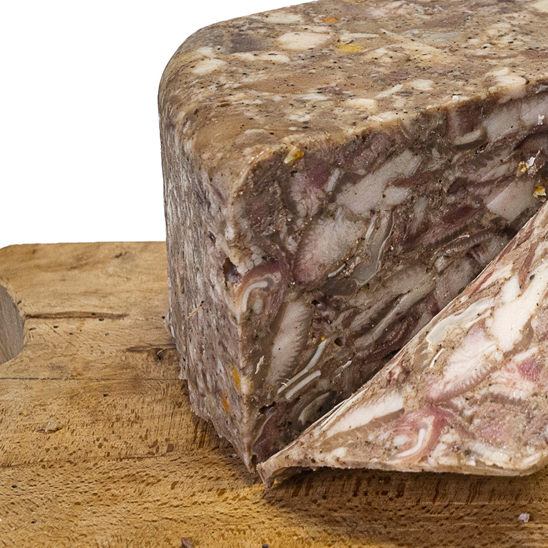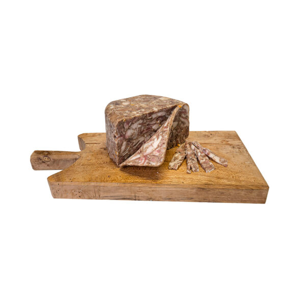 INGREDIENTI: testa di suino (cotenne, orecchie, magro), sale marino fino, pepe, mix di spezie, scorze d’arancia, scorze di limone.